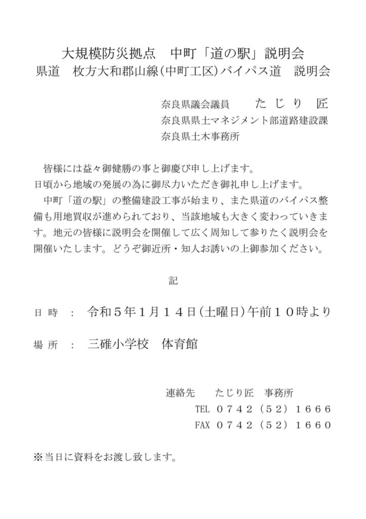 活動実績 2025 / 01 / 14 大規模防災拠点 中町「道の駅」・県道 枚方大和郡山線(中町工区)バイパス道 説明会 中町「道の駅」の整備建設工事が始まり、また県道のバイパス整備も用地買収が進められており、当該地域も大きく変わっていきます。地元の皆様に広く周知を図るため、説明会を開催いたしました。